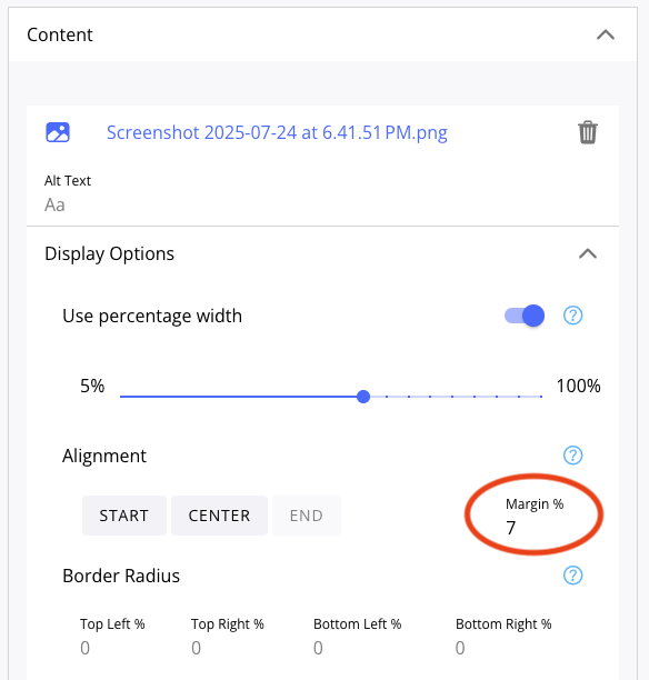 Toggling on use percentage width will let you change the size of the image on the page, from 5% of its size to 100% of its size, in increments of 5%.
