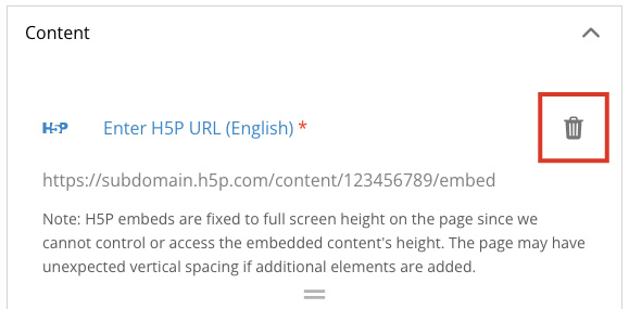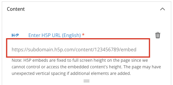 The H5P content will show up on the page, and can be moved and rearranged like any other content piece.