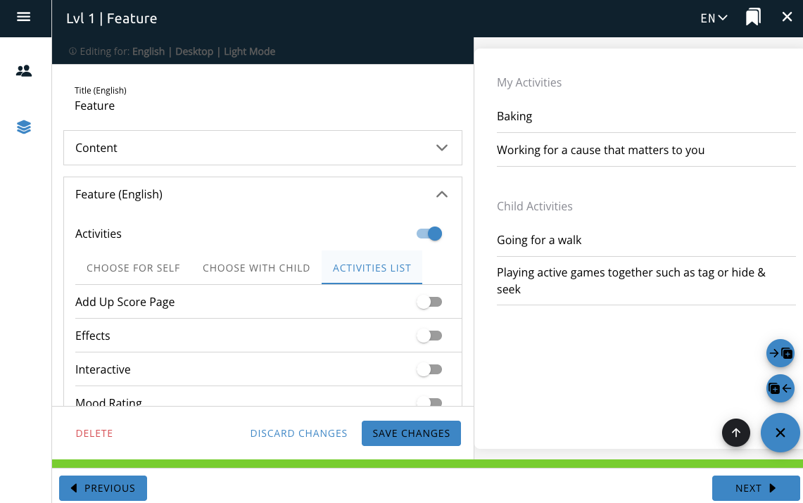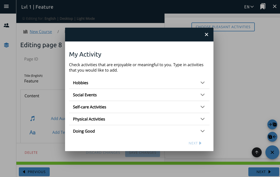 The Activities feature interacts with the Pleasant Activities course option and provides a button or a list on the page for the user to directly interact with the Pleasant Activities functionality.
