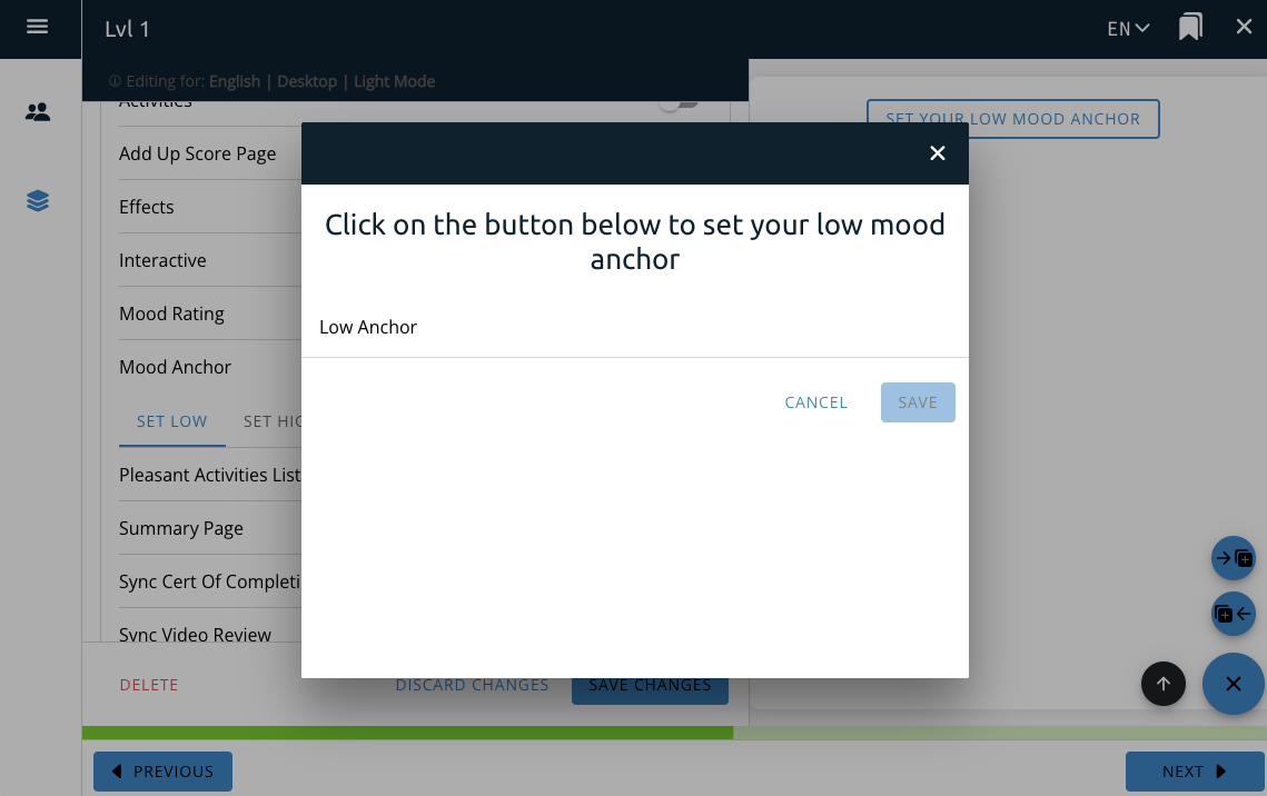 The Mood Anchor feature interacts with the Mood Anchor course option and provides a button on the page for the user to directly interact with the Mood Anchor functionality.