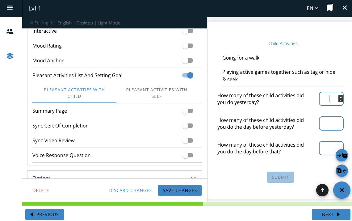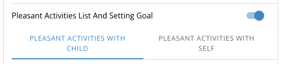 The “pleasant activities with child” and “pleasant activities with self” options will create a list of questions on the page for the user to answer about the pleasant activities they’ve selected previously.