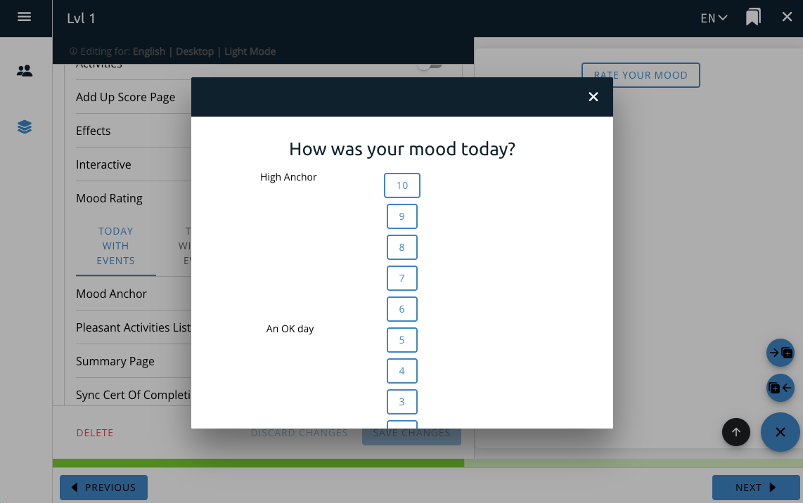 This will add a button to the page that will create a selection box for the user to rate their mood and set their number of pleasant activities.