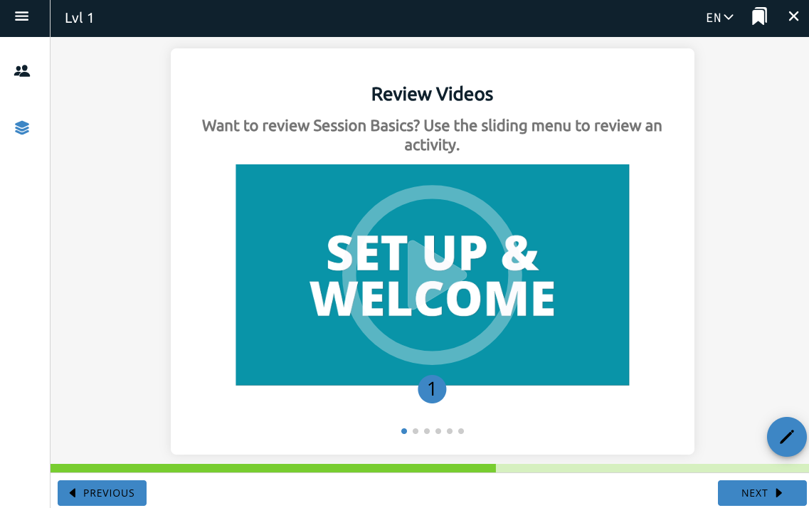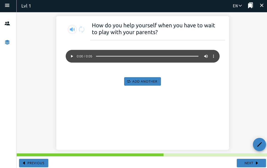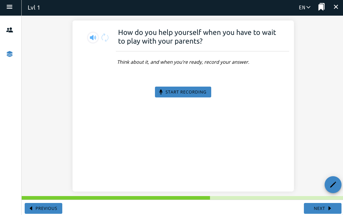 This toggle includes the question on the page. A separate Conversation Bank feature, one of the course features, adds a new section to the app where a user can listen to their recordings from the voice response question feature.