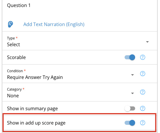 If you toggle on the add up score page feature, this will add a tally to the page that shows the user how many questions they got right.