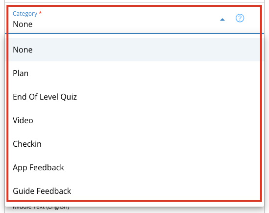 End of Level Quiz — Allows you to categorize a question as a question in an end of level quiz. Questions marked with this category will show up in the user progress report (last two completed levels only.)