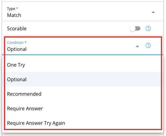 Require Correct — An answer is required, but user must answer until correct. This option only shows up if the question is scorable and not a text type question.