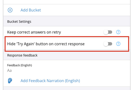 Keep answer on retry — This toggle will keep the answers that are correct in the buckets if the user chooses to retry the question.