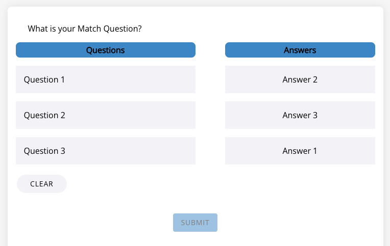 The match question type has users match one answer to one question. Unlike the bucket question type, both question and answer can only be text.