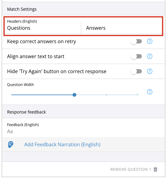 Headers will change how each side of the match game is labeled. They are labeled as Questions and Answers by default.