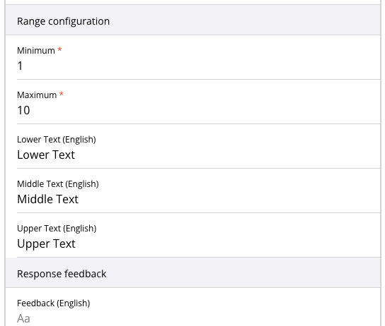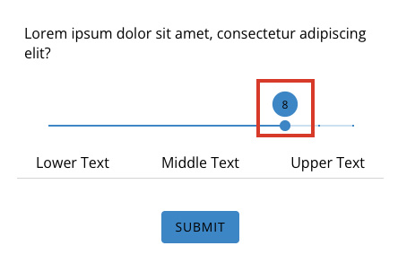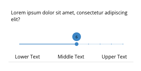 The minimum and maximum numbers on the scale to indicate the length of the scale, and optional text indicators that will show beneath the scale. The text shows up on the movable circle just above the scale with the Lower Text located on the left and Upper Text located on the right.